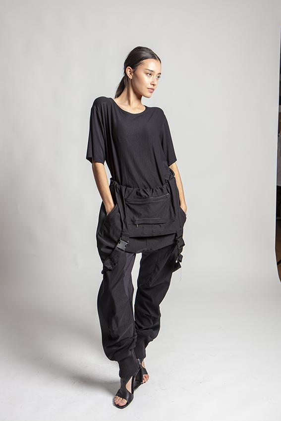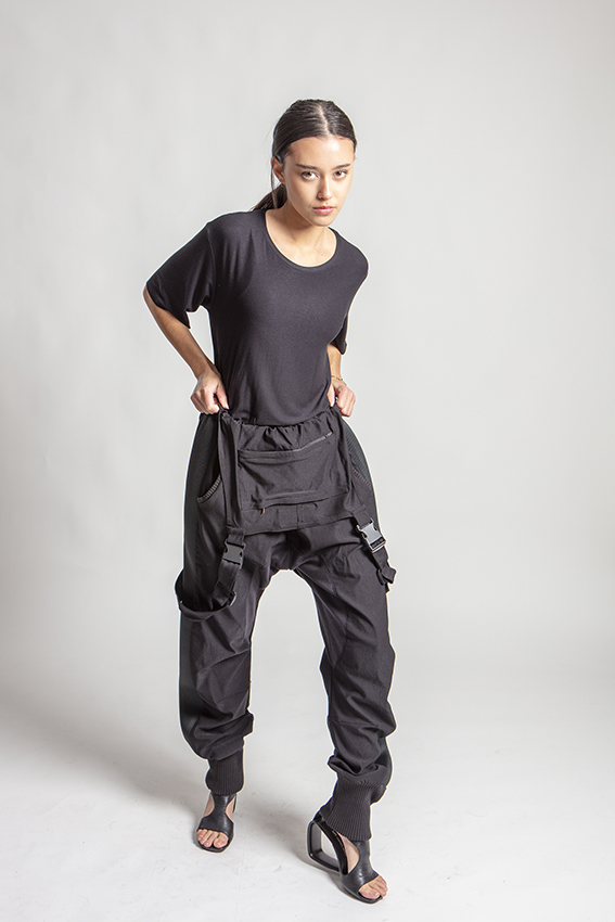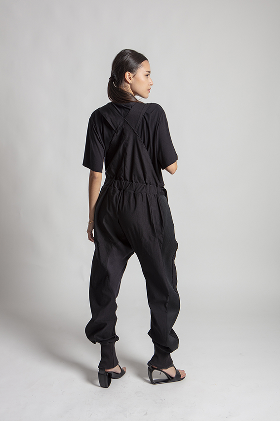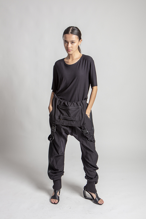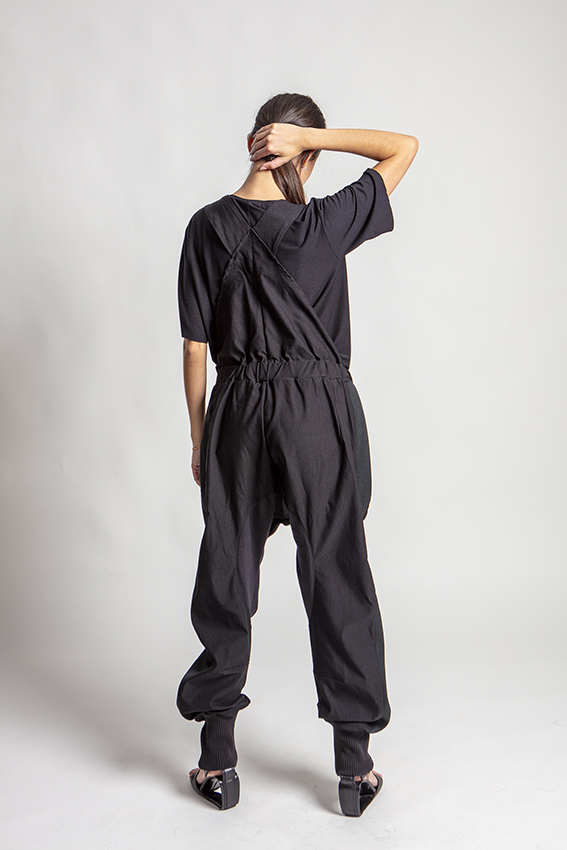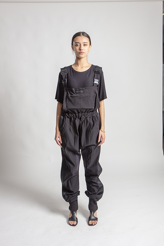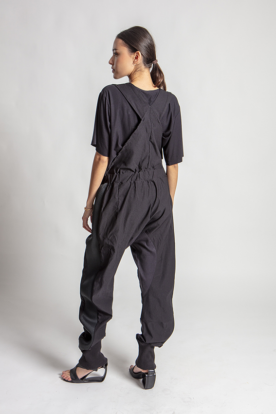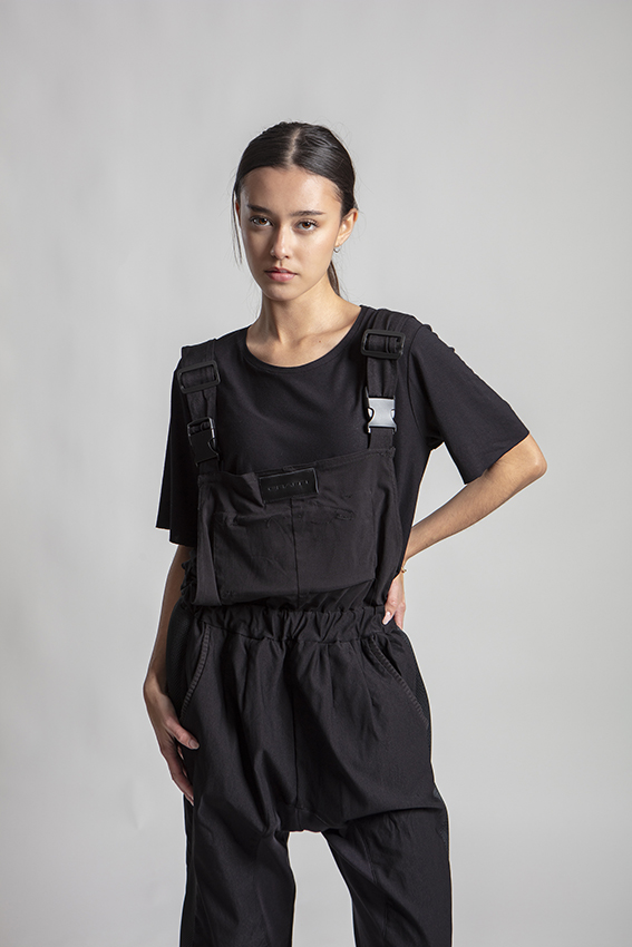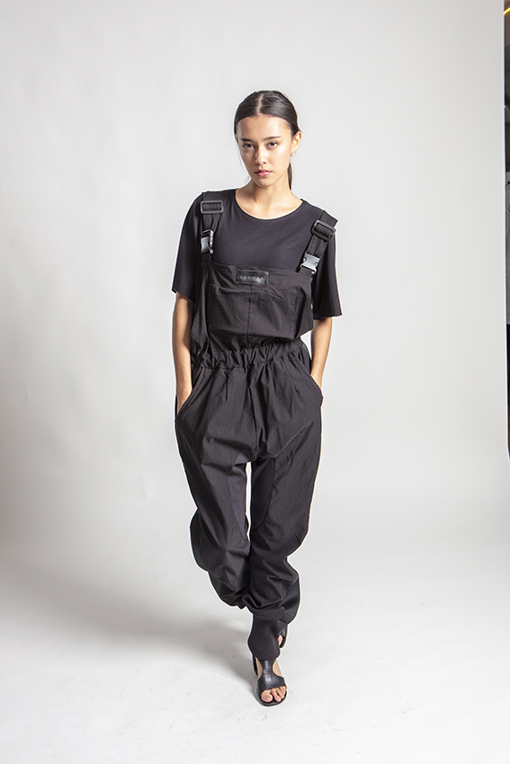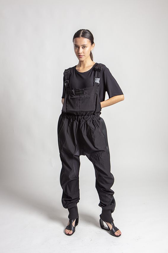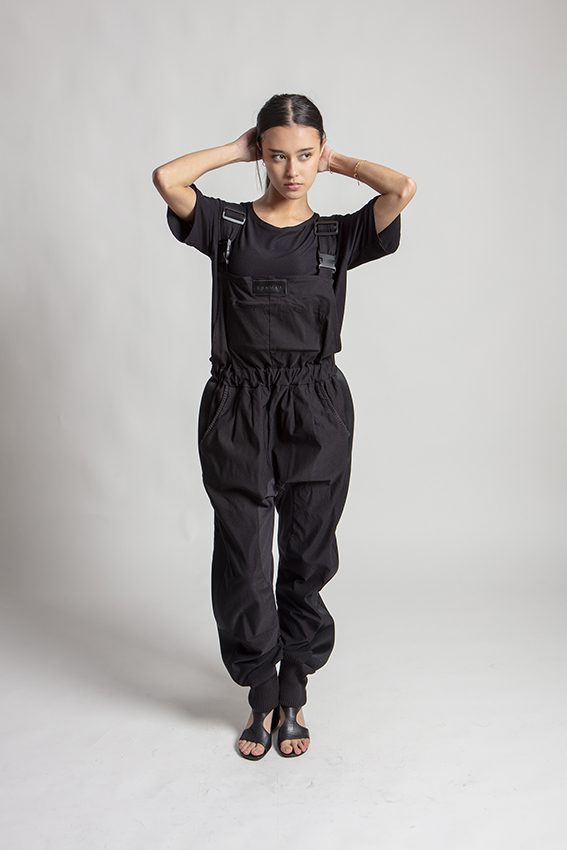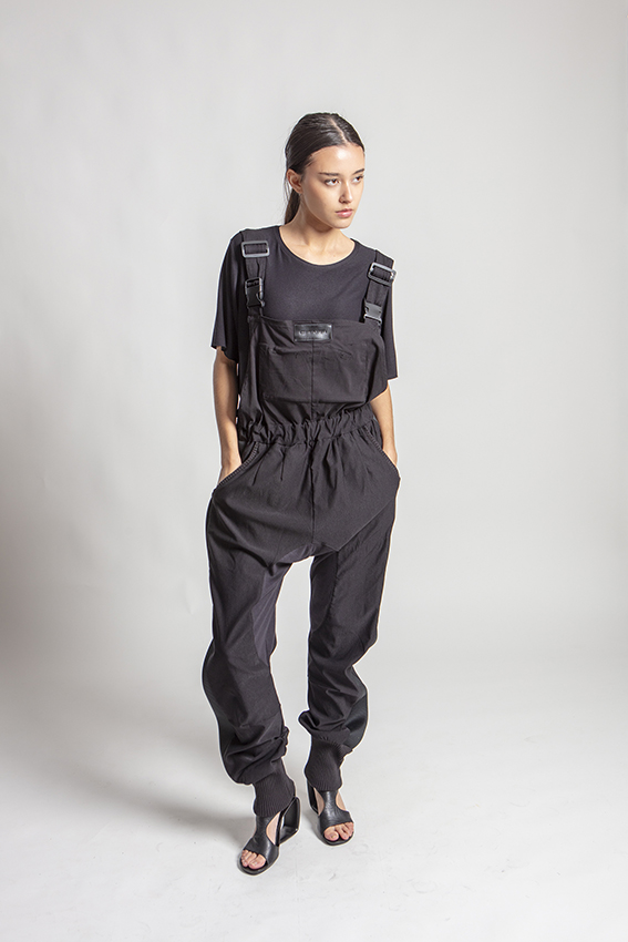The Black Technical Salopette is a functional yet sculptural piece designed for everyday versatility. Crafted from a durable nylon-blend technical fabric, it features adjustable shoulder straps, a soft elastic waist, and a relaxed body that allows layering throughout the seasons. Urban, utilitarian, and distinctly contemporary, it embodies Graffi’s approach to practical tailoring elevated through design.