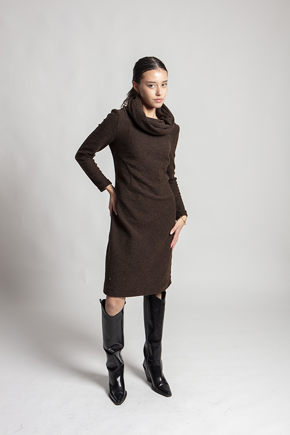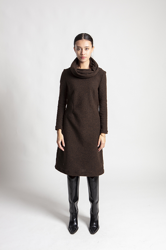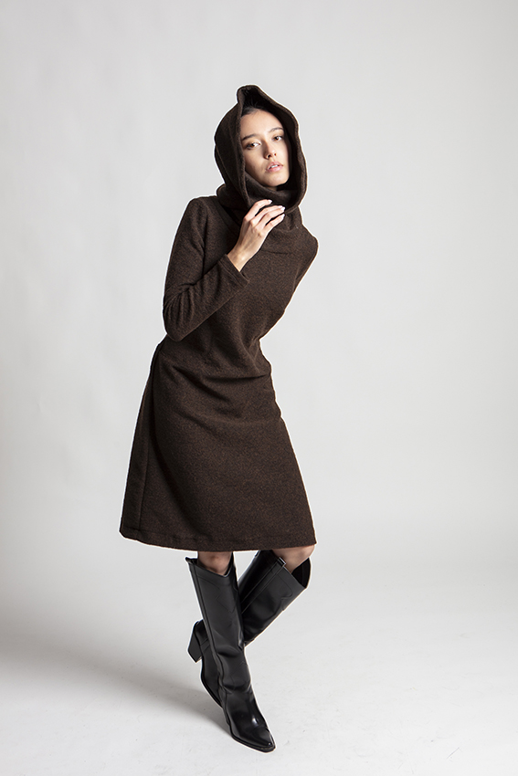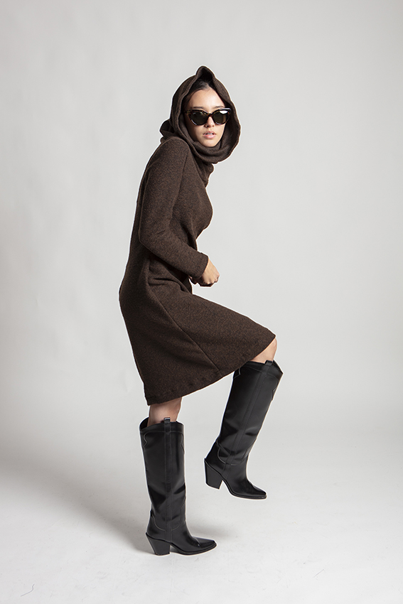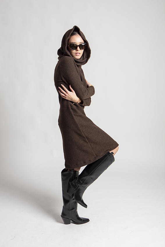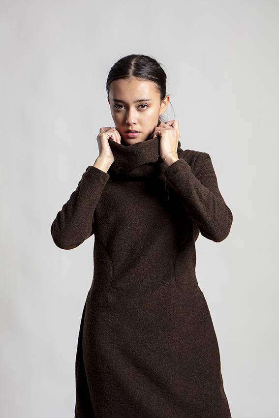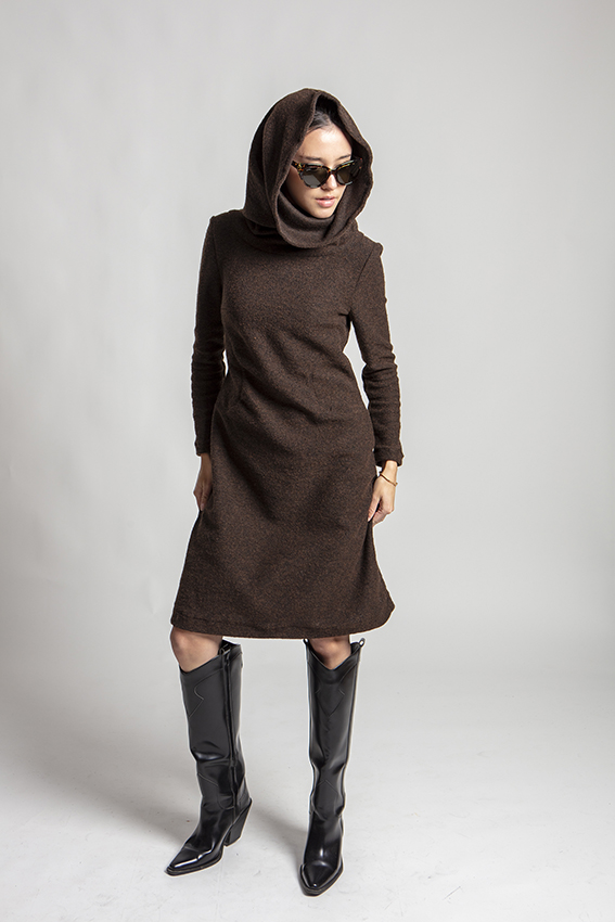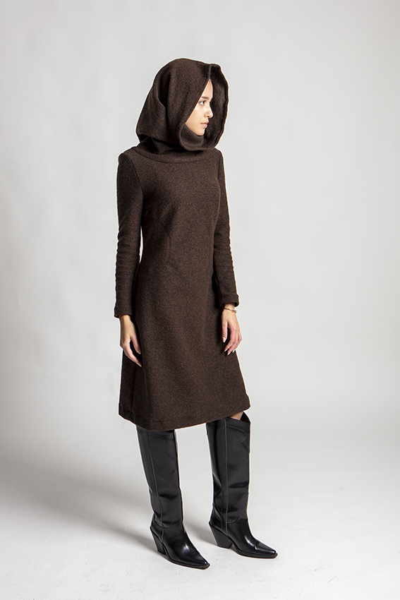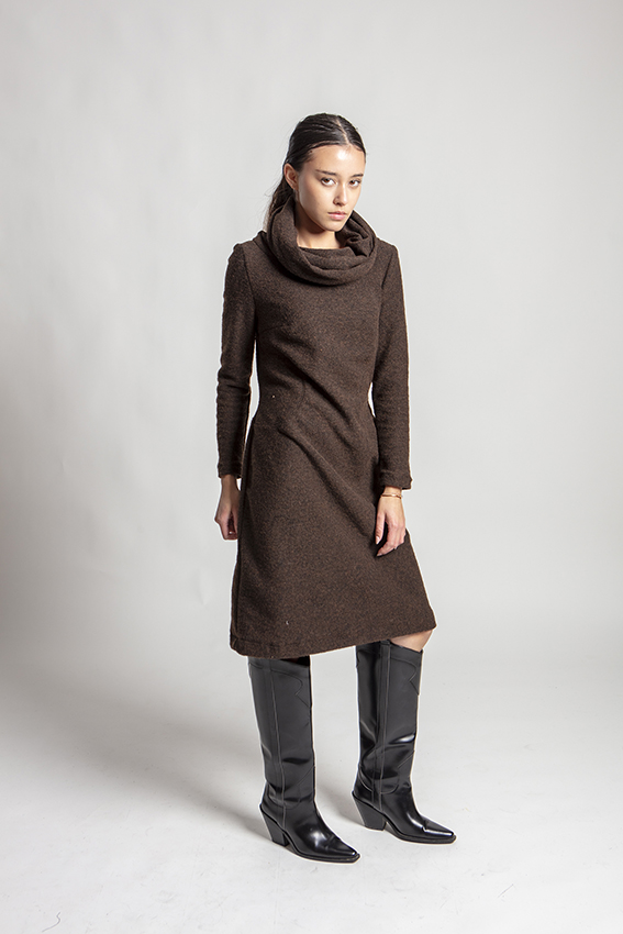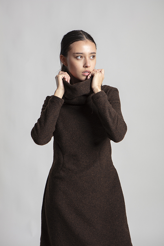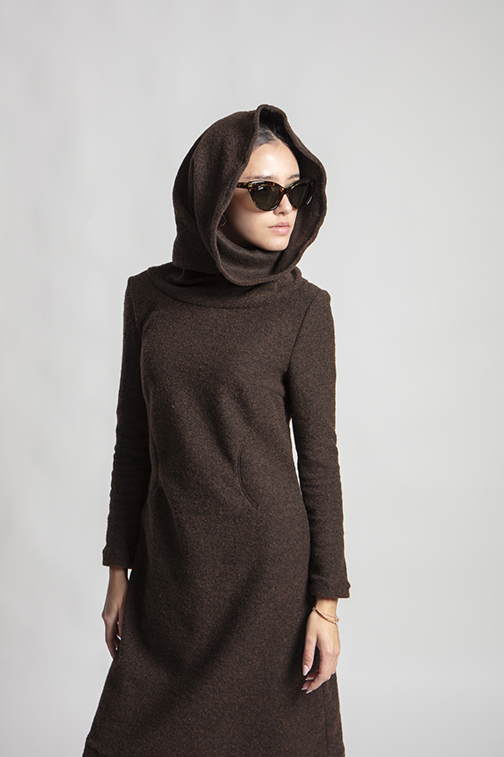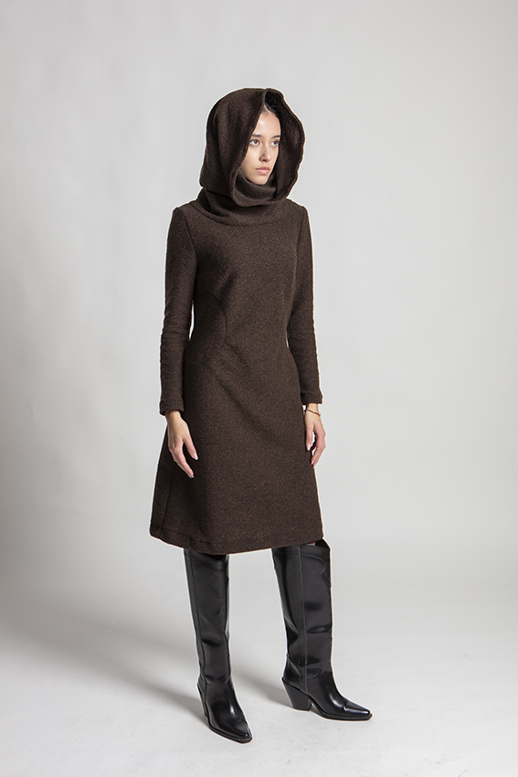 Handcrafted convertible high-neck wool dress with sculptural hood, limited-edition knitwear from Graffi Atelier Barcelona.