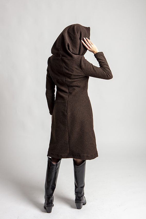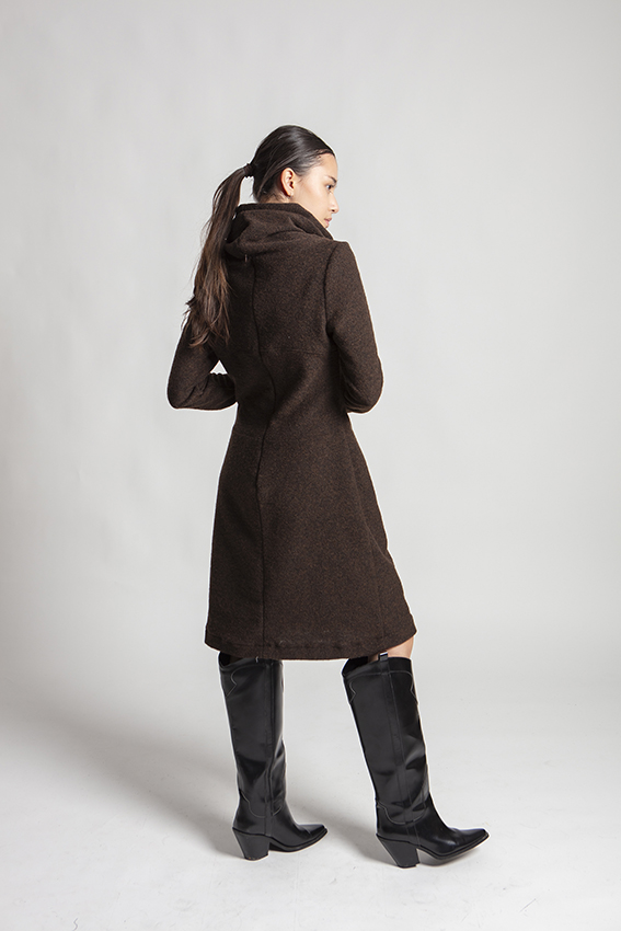 Designed with a convertible high-neck that transforms into a soft, enveloping hood, this piece merges functional elegance with architectural volume. The felted wool offers warmth, comfort and structure, while the silhouette follows the body with subtle shaping. A refined limited-series garment created for women who appreciate artisanal craftsmanship and modern minimalism.