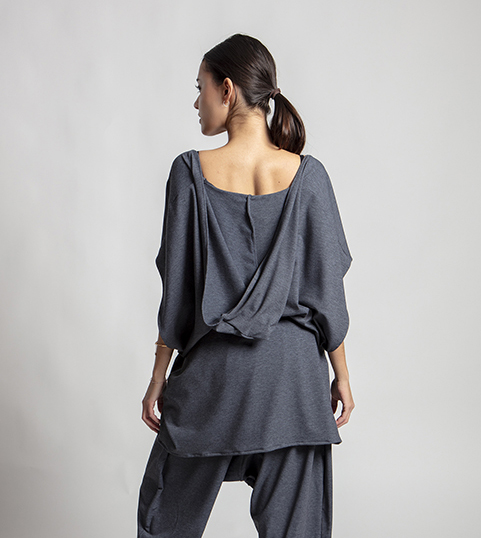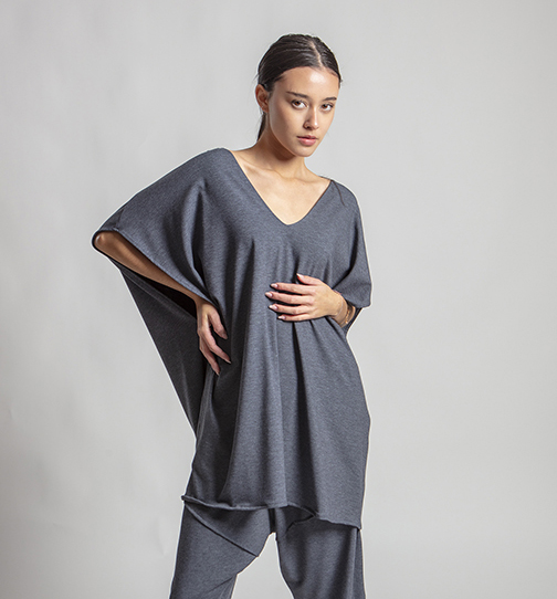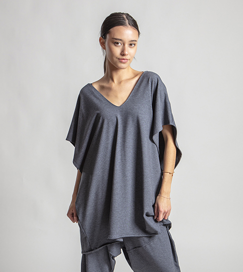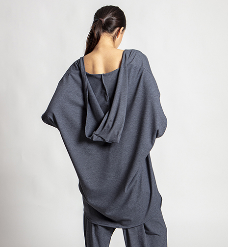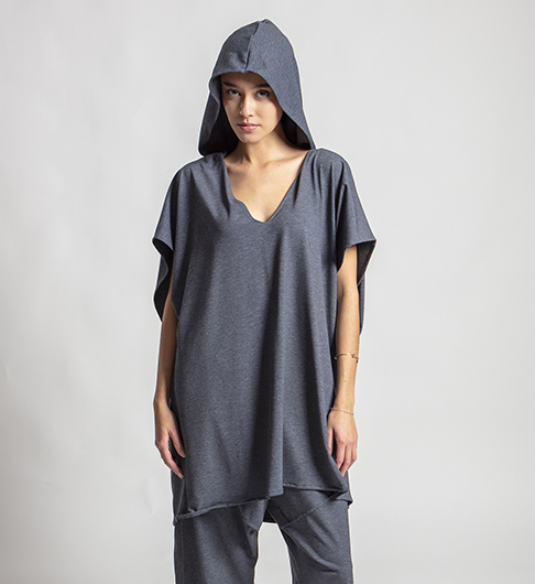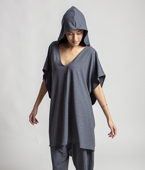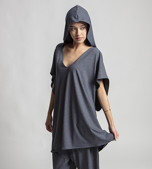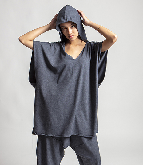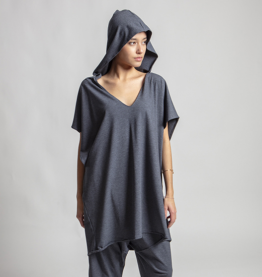 Made from soft, lightweight jersey, this piece combines the comfort of a t-shirt with the character of a hooded garment. The oversized silhouette, deep V-neckline, and integrated hood create a fluid and distinctive shape.