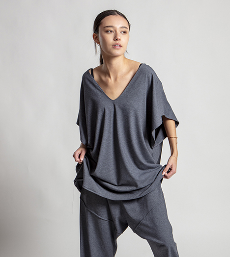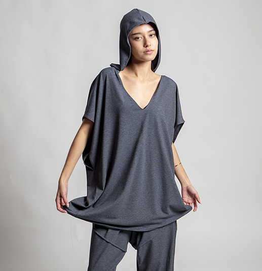 Oversized hooded tee in lightweight jersey with fluid drape and deep V-neck. Minimal, versatile, and designed for everyday layering.