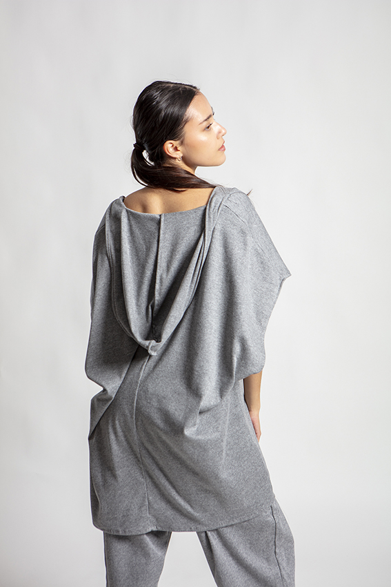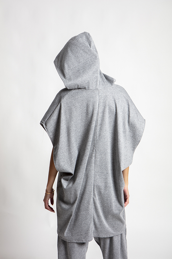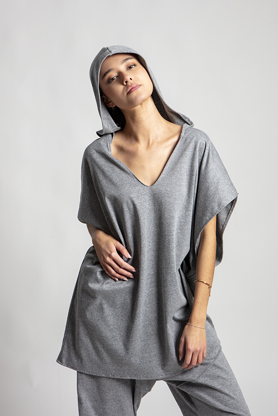 Made from soft stretch jersey, it offers a fluid fit that naturally adapts to the body. The integrated hood adds a distinctive touch, blending casual attitude with refined minimalism.