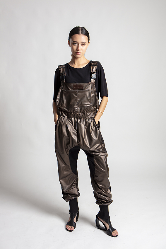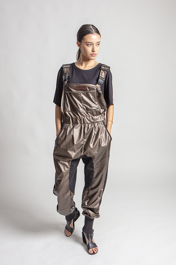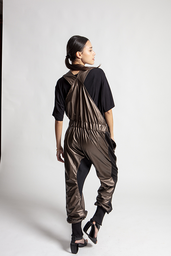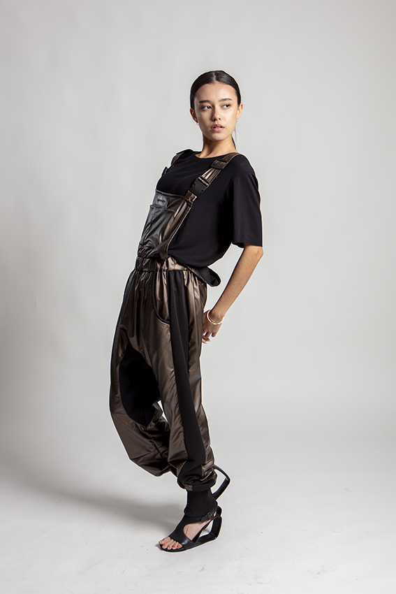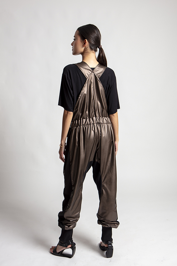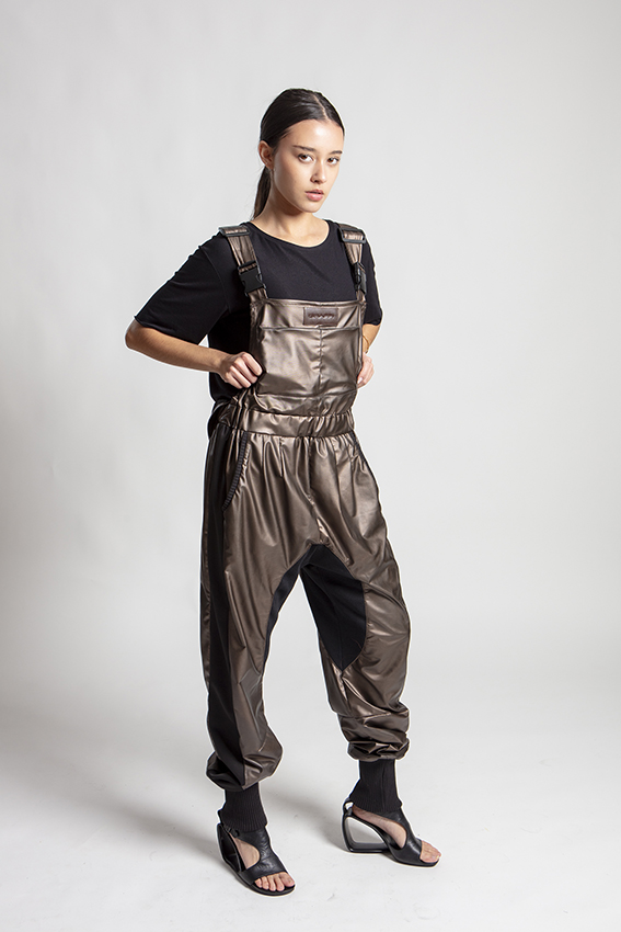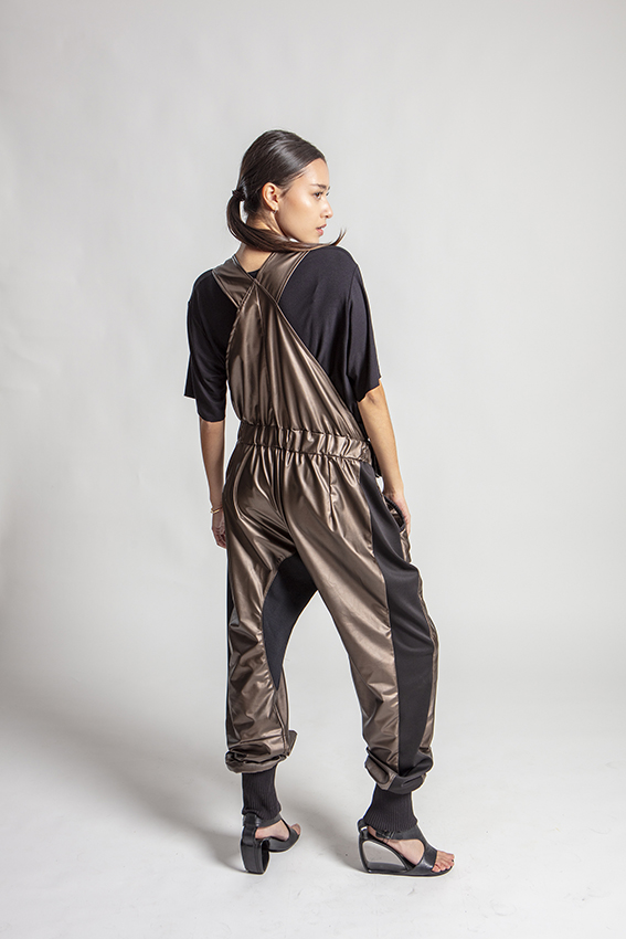 The Golden Salopette stands as a bold, luminous statement crafted in metallic technical satin. Its soft sheen and sculptural lines elevate the garment into wearable art. An elastic waistband and tapered ankles ensure comfort and mobility while maintaining a dramatic, fashion-forward presence. This limited-edition salopette is ideal for collectors who gravitate toward standout pieces with futuristic aesthetics.