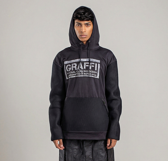 The front is defined by a bold GRAFFI logo print with graphic detailing, reinforcing the brand’s industrial identity. The adjustable hood and front kangaroo pocket enhance comfort and practicality, while the mixed-material construction gives the garment depth and structure.