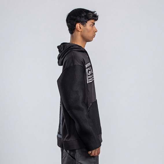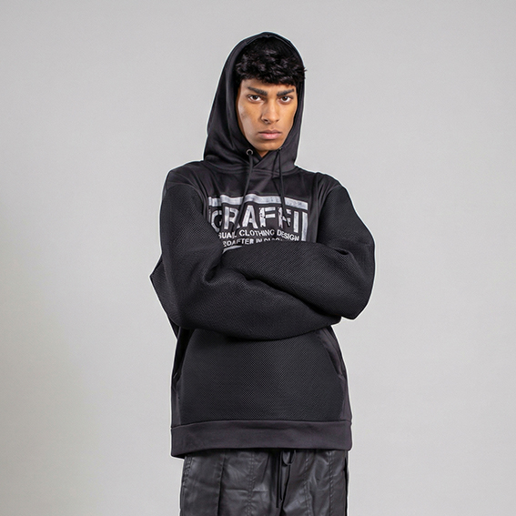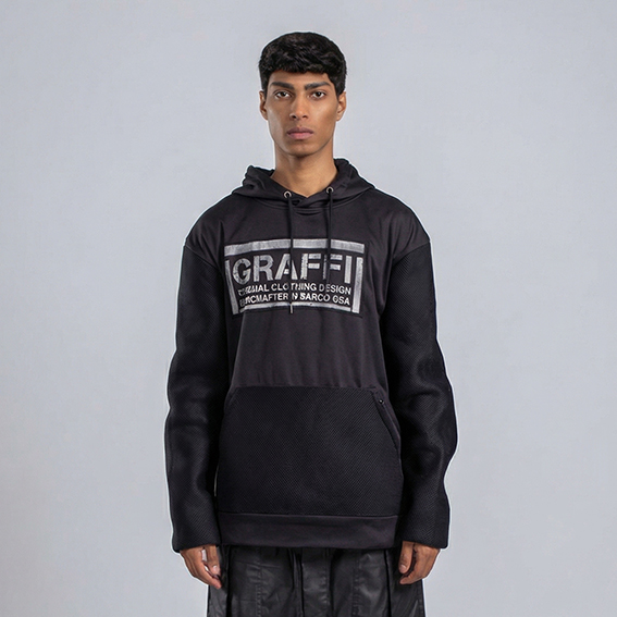 The GRAFFI Black Technical Hoodie blends streetwear attitude with functional construction. Designed with a relaxed unisex fit, this hoodie features contrasting technical mesh panels on the sleeves and lower body, adding texture, breathability, and a distinctive architectural look.