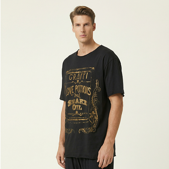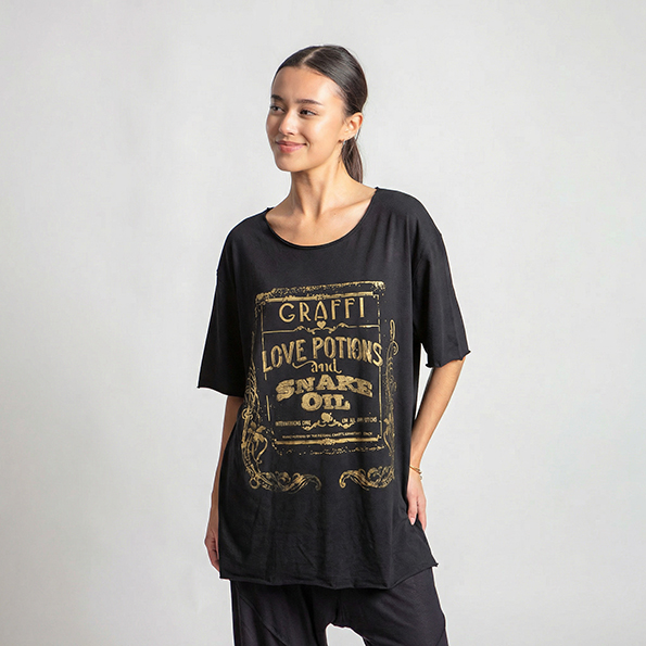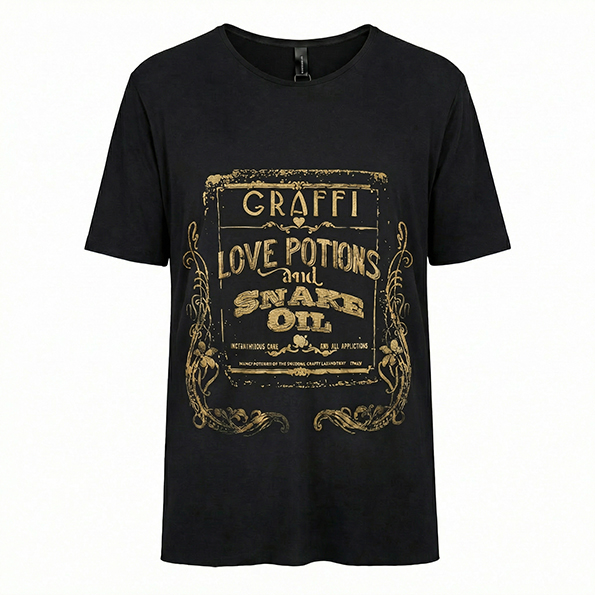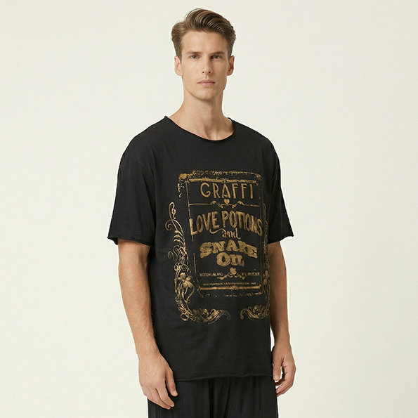 The Love Potions – Black T-shirt features handcrafted artwork with a vintage-inspired graphic feel. Created on soft, slightly elastic black cotton jersey, this piece is individually hand-painted, ensuring every single T-shirt is unique. A relaxed fit and raw-cut details complete the handmade aesthetic.