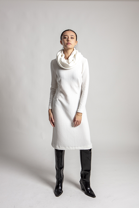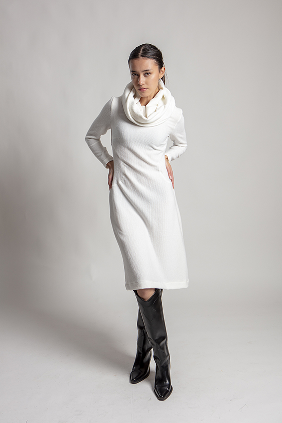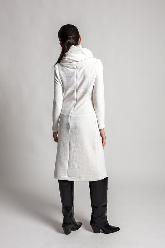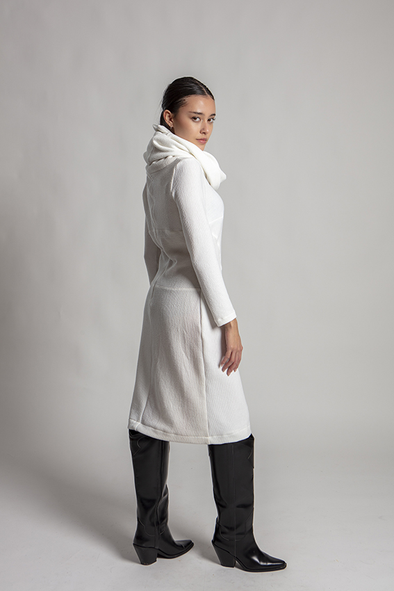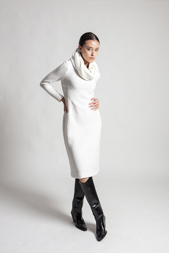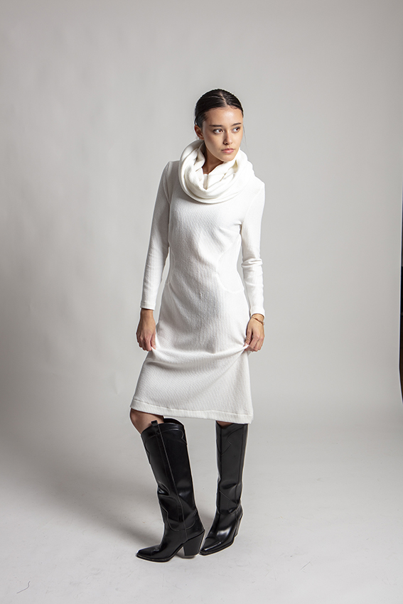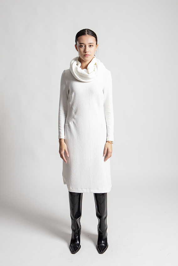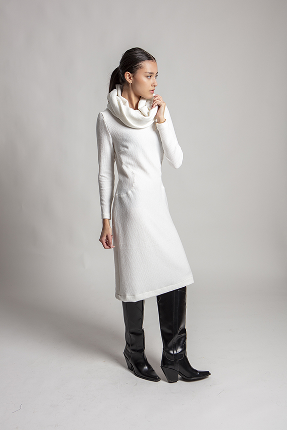 Elegant white high-neck wool dress with minimalist architectural silhouette.